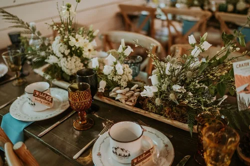 They went with a Vintage Steak house theme featuring custom stamps for their dishware, lamps and bread baskets galore.